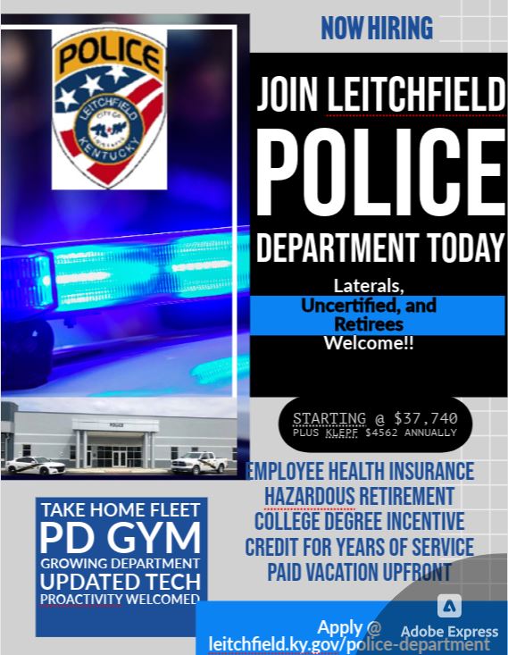 The Leitchfield Police Department consists of 19 sworn officers including 2 School Resource Officers, 1 Detective, 1 drug task force Detective and 1 secretarial staff. In 2022, LPD was awarded accreditation for a fourth time since 2006 through the Kentucky Association of Chiefs of Police. In 2024 LPD received a 100% score for Safety and Liability Review from the Kentucky League of Cities.